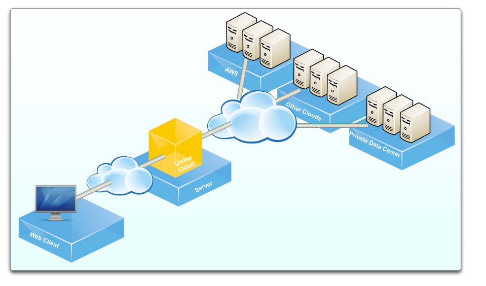 With DivineCloud, seamlessly manage 1000's of servers (physical or virtual) located across any private cloud or public cloud - AWS, Google, Rackspace, Digital Ocean, Joyent, Linode, etc.